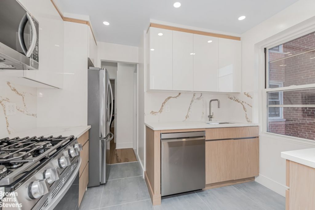 Renovated Kitchen: Equipped with brand new stainless steel appliances, quartz countertops, a sleek tile backsplash, microwave, and dishwasher. The new porcelain kitchen floor adds both elegance and durability. The modern design flows seamlessly into the living space, making it perfect for both cooking and entertaining.