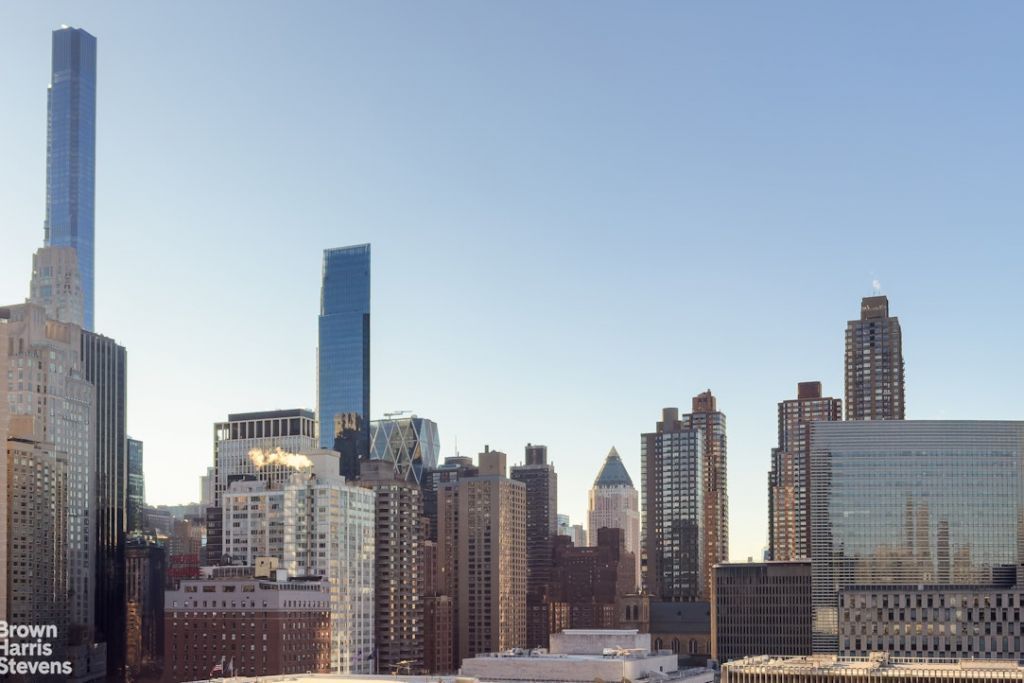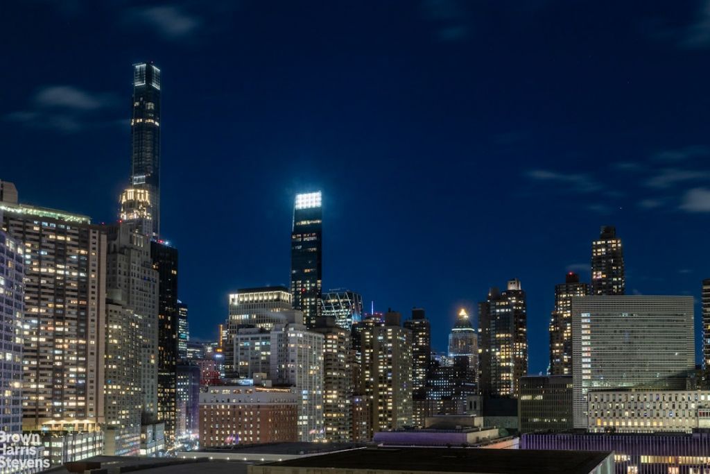 Sunlight floods through the windows of this spacious 1,577 square ft. home overlooking Lincoln Center, with views of the Manhattan skyline and multiple exposures. It has a meticulously designed partially closed off kitchen with made to measure cabinetry, underfloor heating, quartzite stone countertop and Viking stainless steel appliances including a dishwasher. The kitchen tiles for the backsplash and all are from Porcelanosa. With a stackable vented washer/dryer along with two full bathrooms and a powder room, this home offers the best of New York City living.