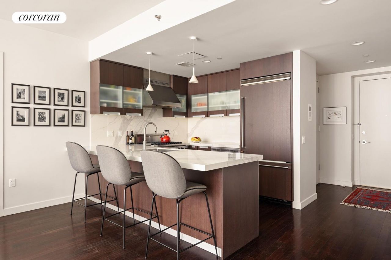 A bright northern exposure and floor-to-ceiling windows flood the oversized living and dining area with natural light, while the open-concept kitchen creates an ideal setting for both everyday living and effortless entertaining.